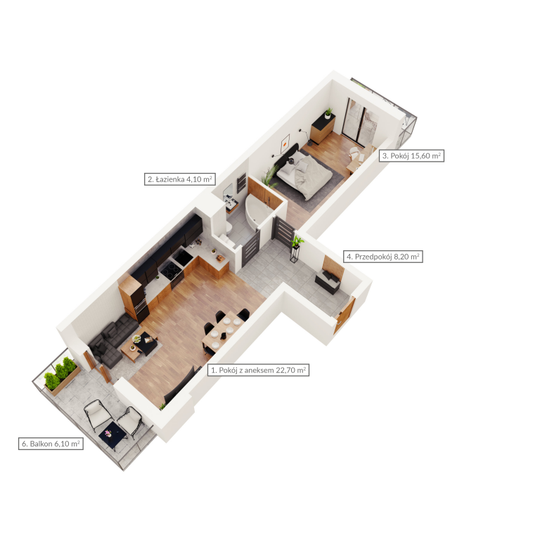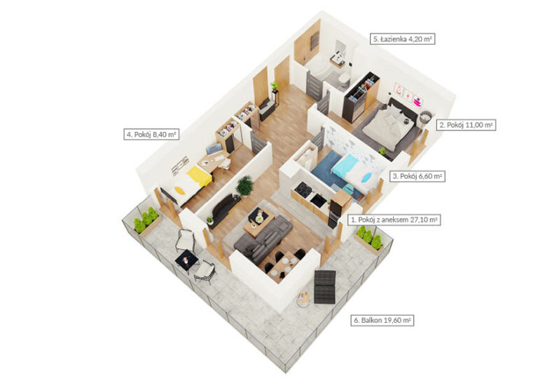 NR: Nr: 2.1.6 Piętro: 1 Pokoje: 3 Powierzchnia: Pow: 60,10m2 Balkon: 27,10m2 : 2 Rezerwacja Więcej