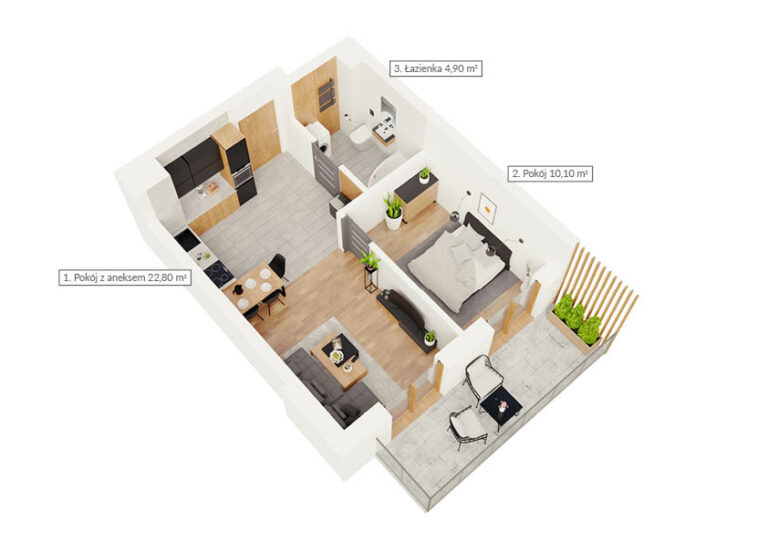 NR: Nr: 3.2.9 Piętro: 2 Pokoje: 3 Powierzchnia: Pow: 44,90m2 Balkon: 17,60m2 : 3 Rezerwacja Więcej