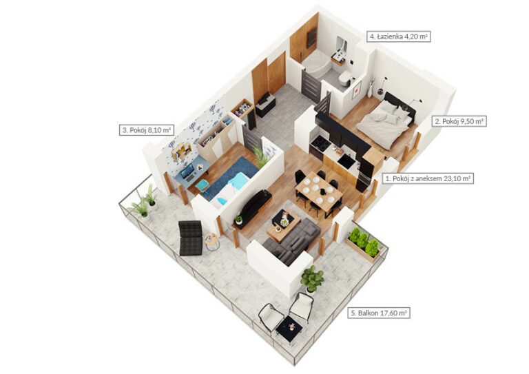NR: Nr: 2.0.10 Piętro: 0 Pokoje: 3 Powierzchnia: Pow: 44,90m2 Balkon: 17,60m2 : 2 Rezerwacja Więcej